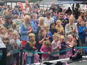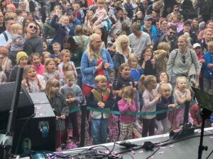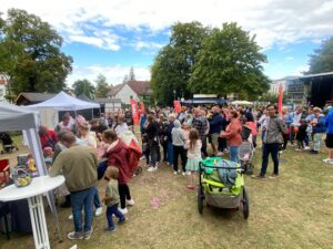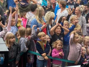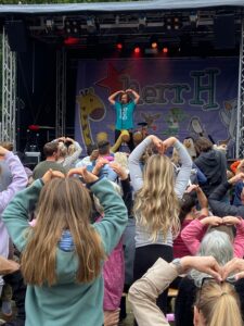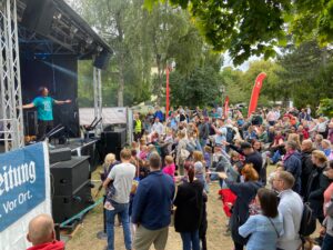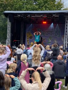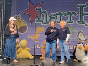 Schon einige Zeit vor dem Konzertauftakt füllte sich die Fläche vor der „Jungen Bühne“ am Wilhelmshaven-Dreieck zwischen Weißer Brücke und Badepark. Mit von der Partie waren auch viele Erwachsene, die erkennbar nicht nur dabei waren, um Kinder und/oder Enkel zu beaufsichtigen. Große wie kleine Fans waren vielmehr mit Feuereifer dabei, wenn herrH zum Mit-Singen und -Tanzen aufforderte.